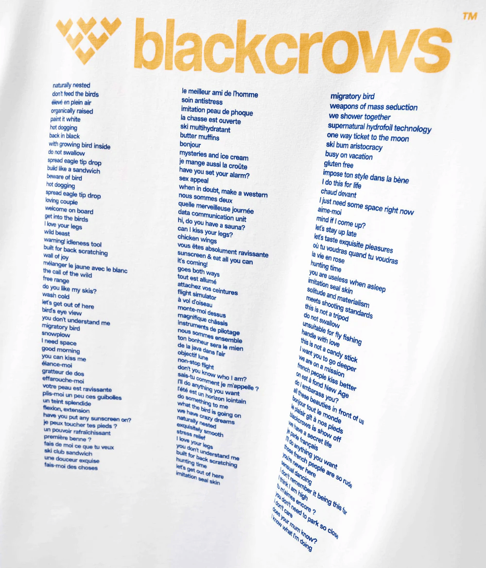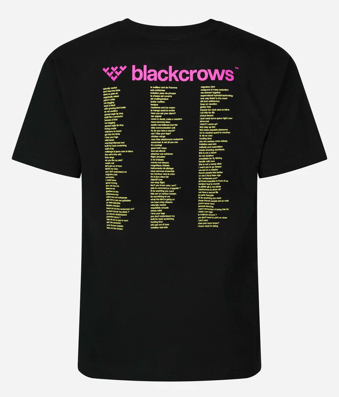 La marca contemporánea de freeski Francesa originaría de Chamonix Blackcrows nos presenta una camiseta con este lema . ¿deberíamos tomarlo al pie de la letra? cada uno es libre de elegir. una prenda de manga corta, 100 % algodón orgánico, para lucir con alegría e inocencia, especialmente para quienes se sientan atrás y la leen como una caja de cereales, pero con magia. ¡súbete atrás y déjame volar !