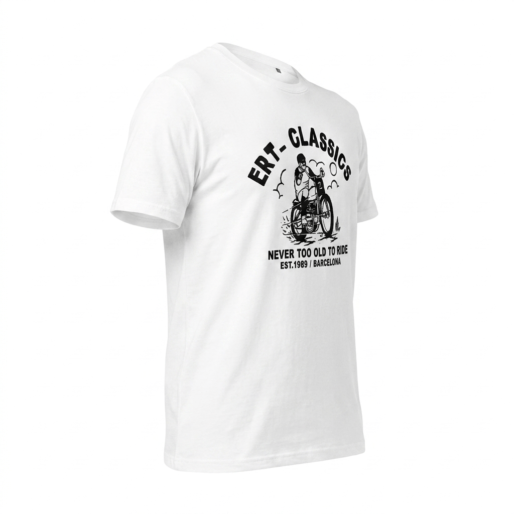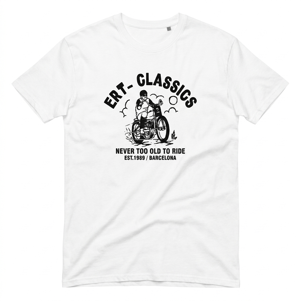 Nuestra camiseta número 1 este invierno 25/26 ahora con manga corta. Fabricada con 100% algodón peinado de 180 g/m² gramaje, cuello medio clásico, cuello y hombros sellados para mayor comodidad y durabilidad, fit tallaje regualr. A esta calidad súmale nuestro nuevo print " Never Too Old to Ride ", porque lo que importa es la actitud ¡¡¡