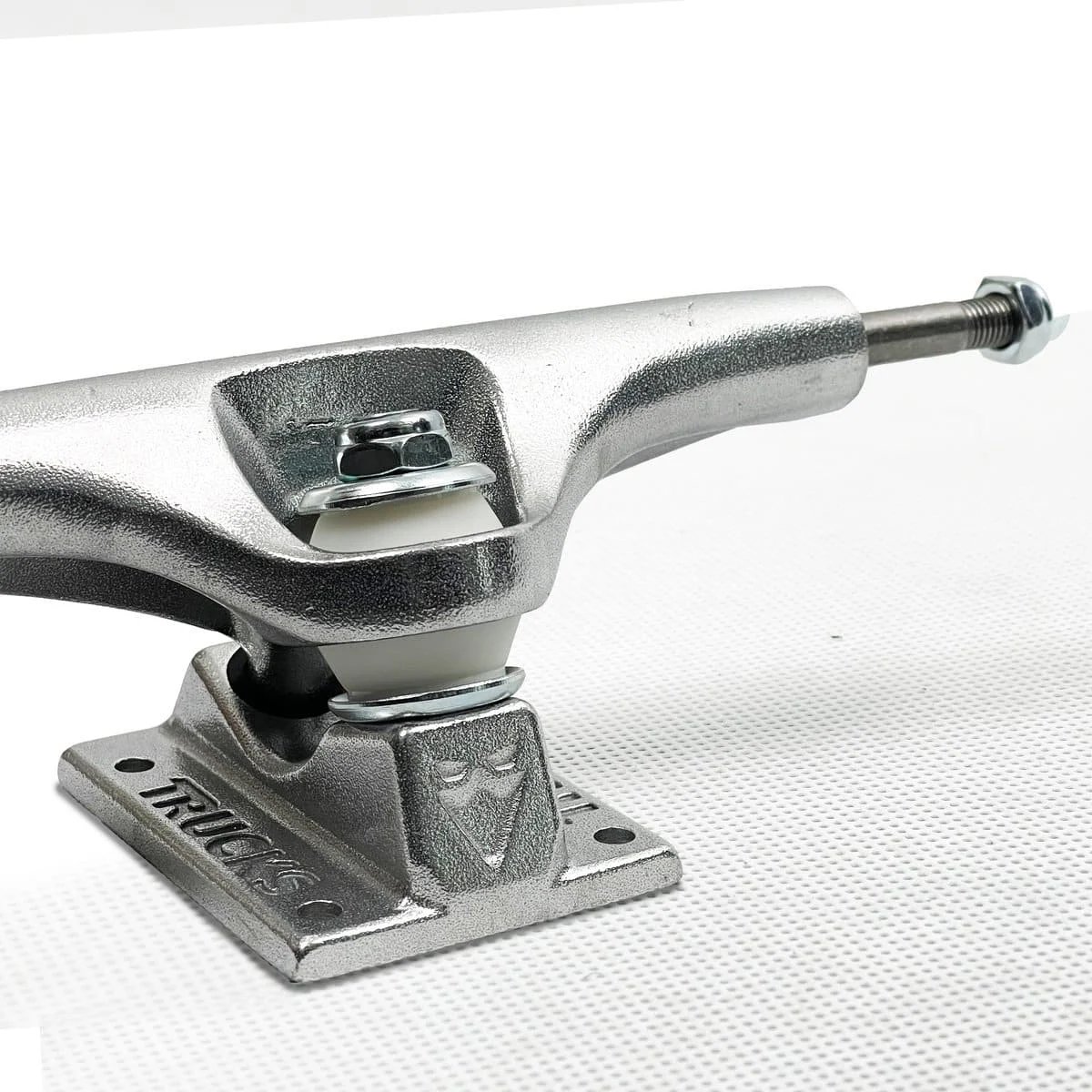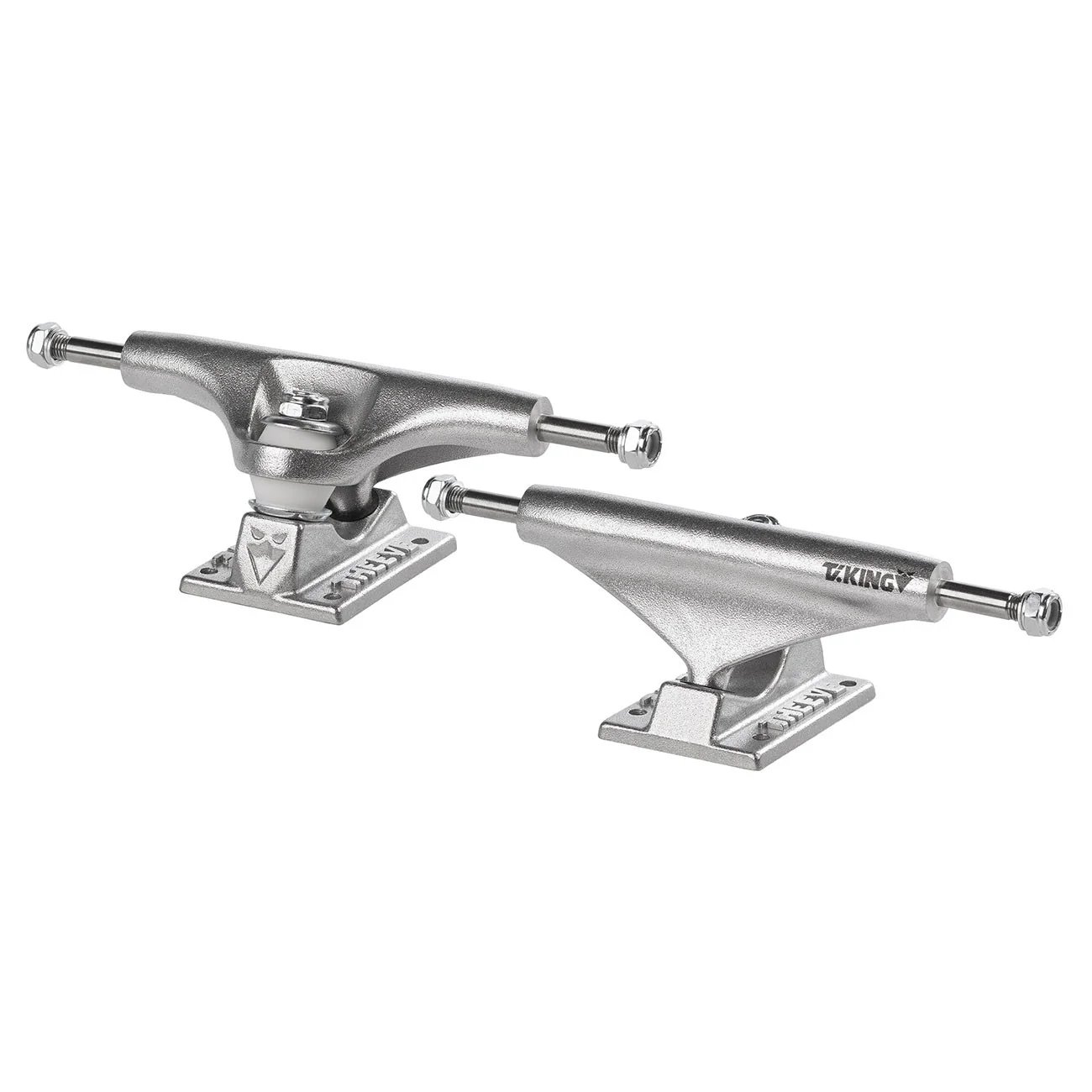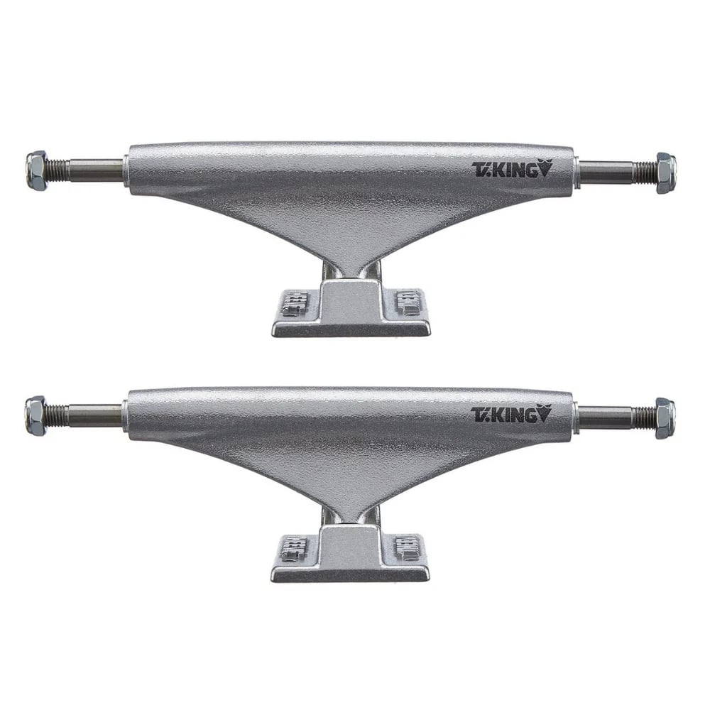 El TiKING cuenta con la misma resistencia, durabilidad y destreza que los Theeve Trucks, pero con los kingping de acero hueco (hollow ). Gracias a la geometría True Turn de Theeve, el TiKING ofrece una relación pivote central/soporte superior, garantizando una larga vida útil del eje y permitiendo grinds probablemente mejores que cualquier otro eje del mercado. Soporte central y base de fundición clásicos, Axle (eje ) titanio 6/4 antideslizante, kinpings de acero huecos, gomas de alta resistencia de 55 mm de altura hasta el centro del eje. Ejes de la más alta calidad.