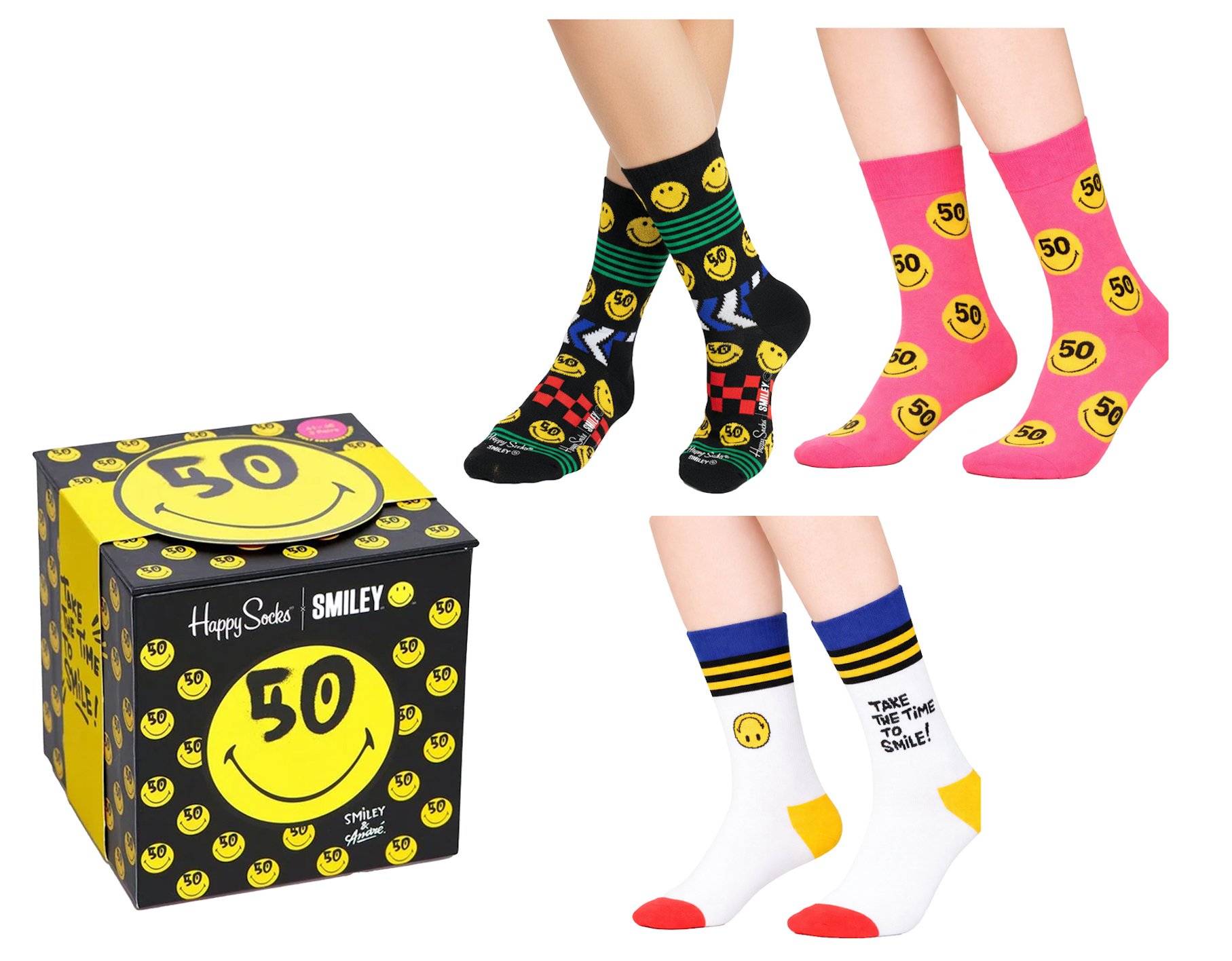Con esta caja con 3 calcetines Smiley serás todo sonrisas. La edición para coleccionistas Smiley de Happy Socks, una gama completa lanzada como celebración de su 50º aniversario, ha sido diseñada para ponerte una sonrisa tanto en el rostro como en los pies. Diseñados en colaboración con el grafitero de fama internacional André Saraiva.